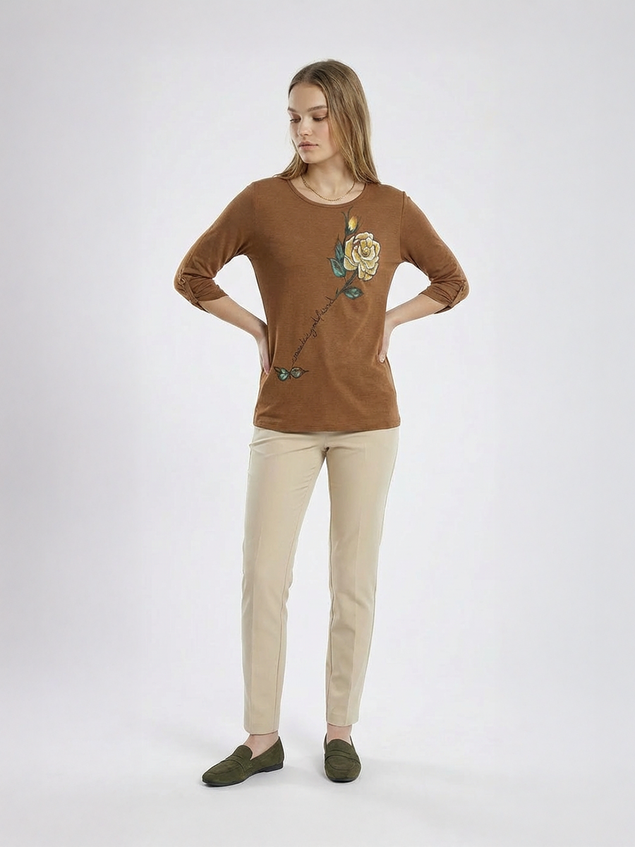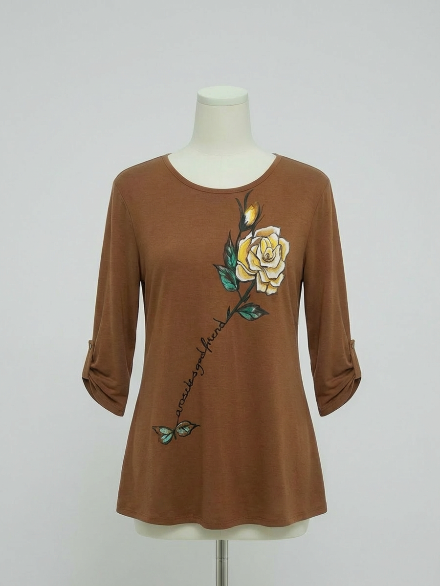 Brown top with 3/4 sleeves and a single yellow rose illustration with script detail.
