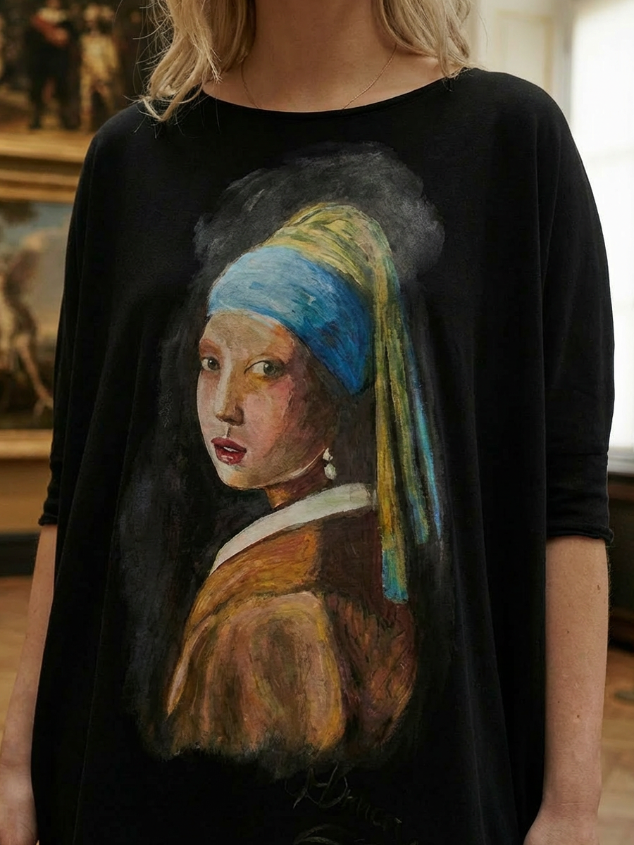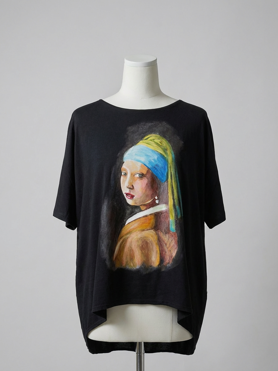 Black short-sleeve top with a large hand-painted portrait on the front.