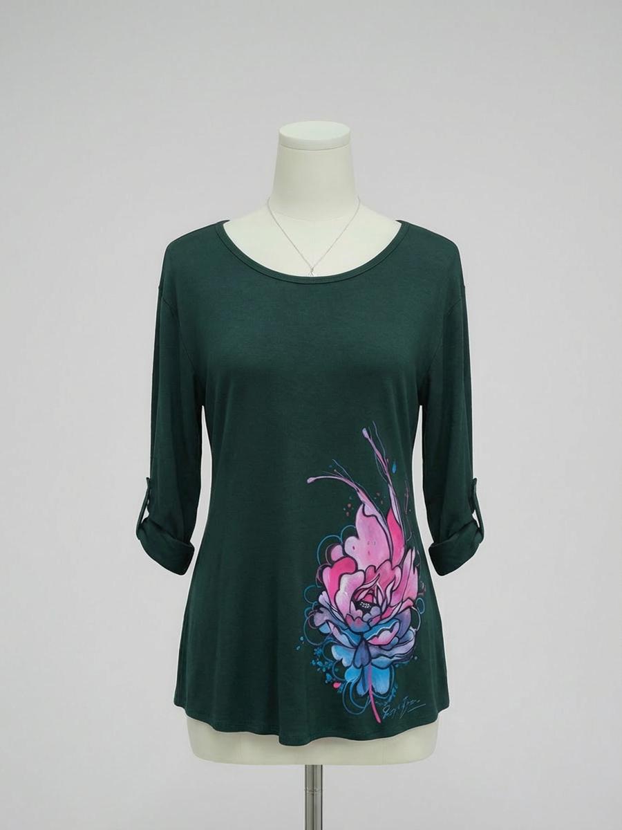 Dark green long-sleeve top featuring a pink and blue abstract floral design.