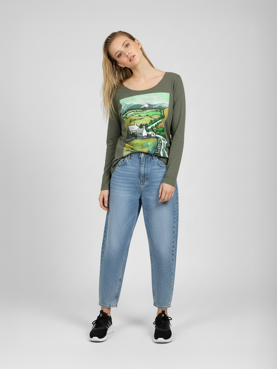 Olive-green long-sleeve top with a colourful countryside landscape design.