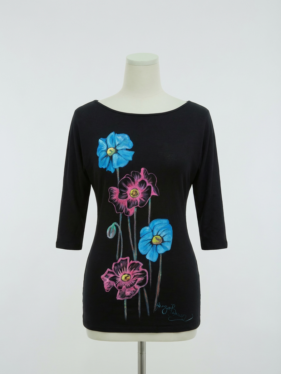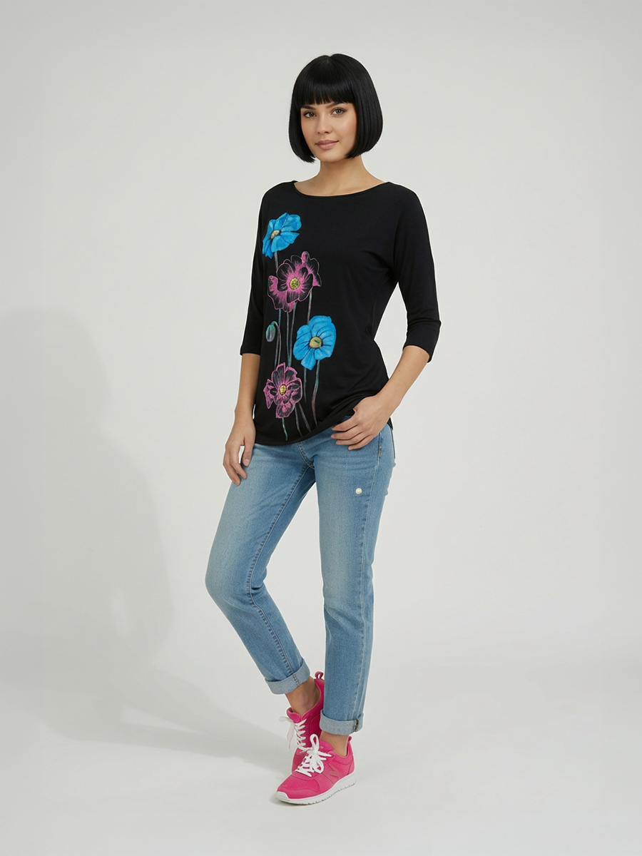 Black 3/4-sleeve top decorated with blue and pink floral graphics.
