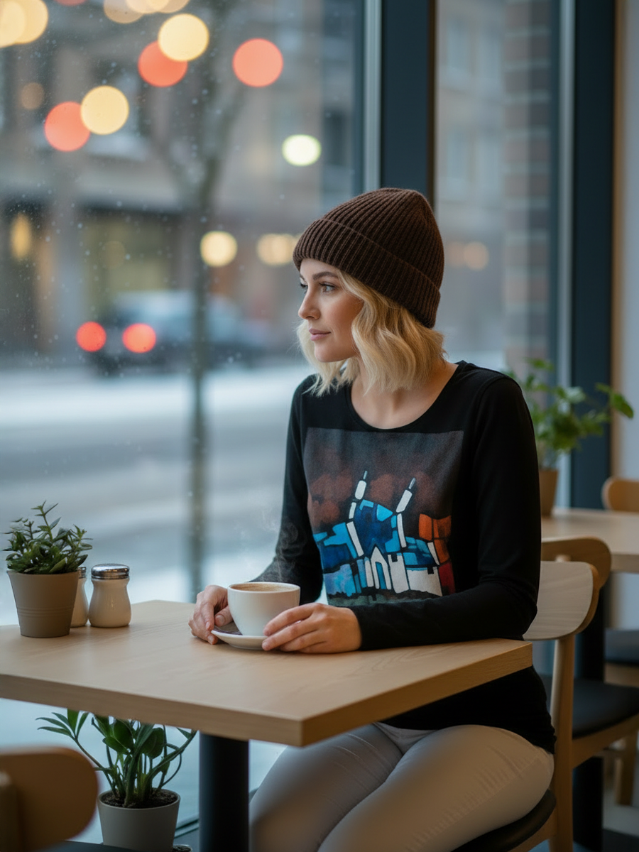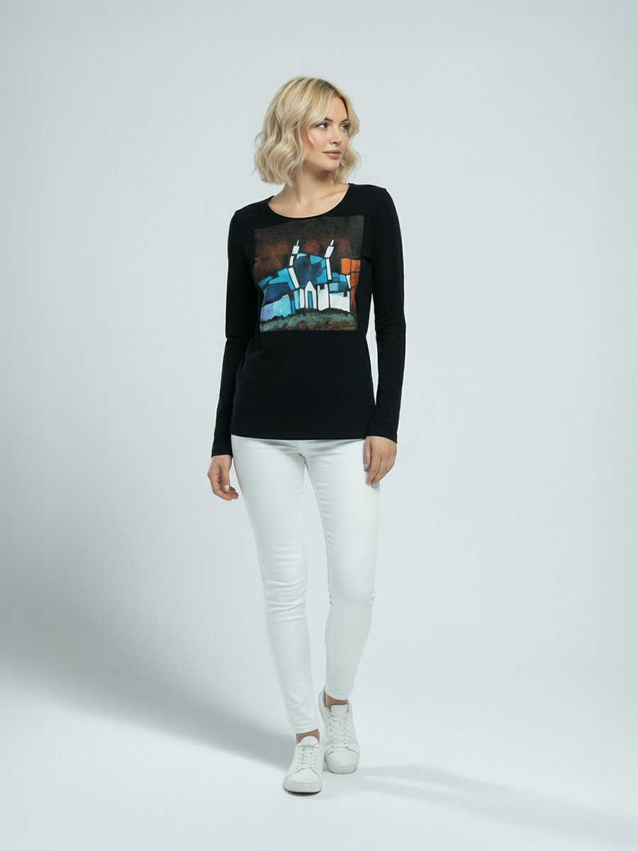 Black long-sleeve top featuring a multicolour abstract village scene.